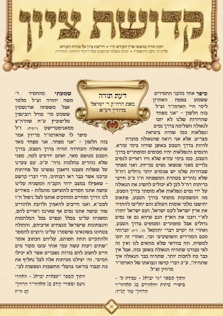 ארצנו הקדושה נתונה לנו מאדון העולם בשבועה וברית עולם למען לחיות בה חיי התורה לשמה ולקיים מצותיה, ועם ישראל קשור בה בכל רוחו ונשמתו לנצח נצחים, ומפני חטאינו גלינו מארצנו והשי"ת הבטיח לנו ע"י נביאיו הקדושים כי יגאלנו ע"י משיח צדקנו וזה עיקר מעיקרי דת קדשנו אשר כל בן ישראל מחוייב להאמין בזה. זכות עם […]