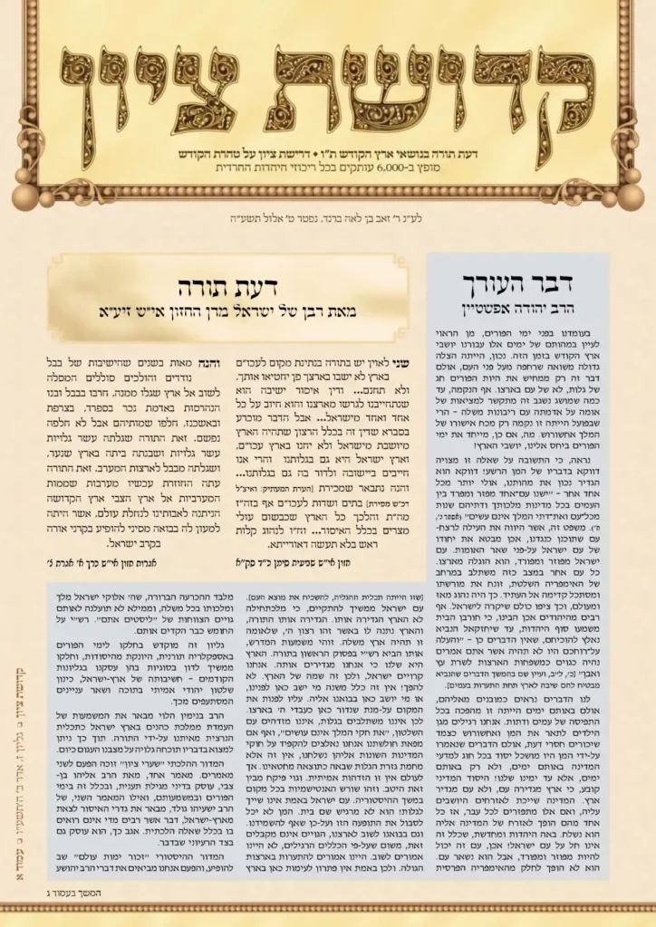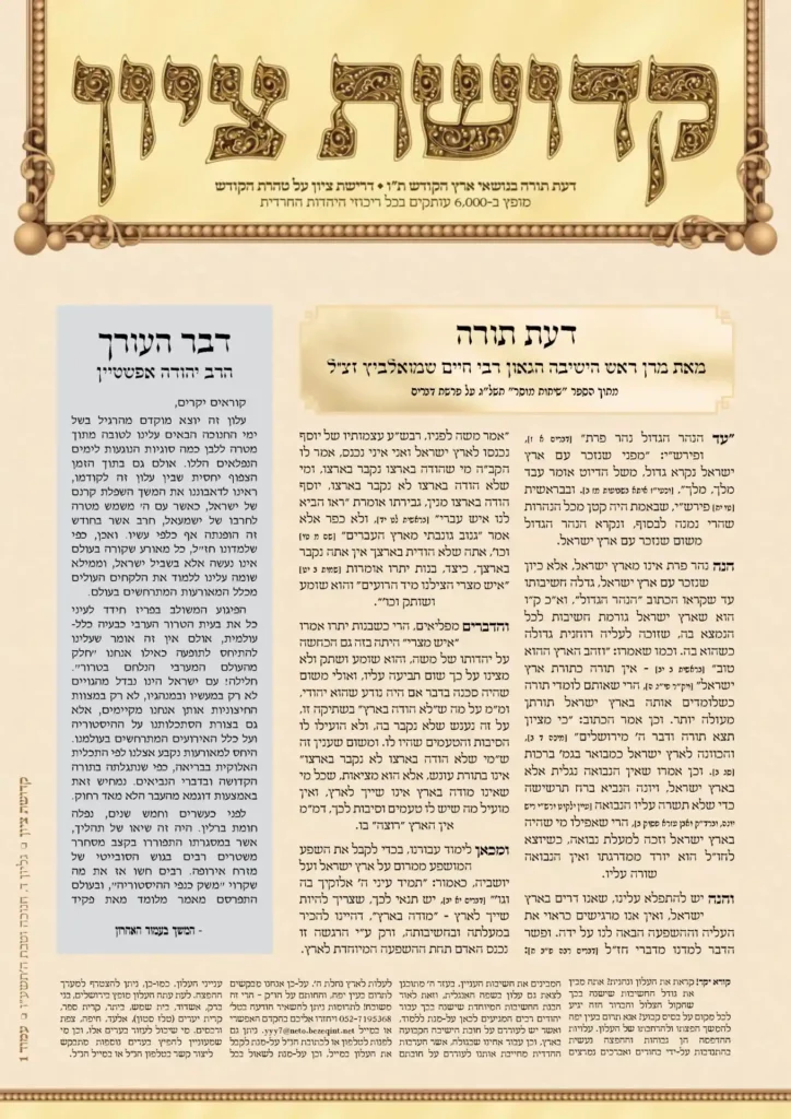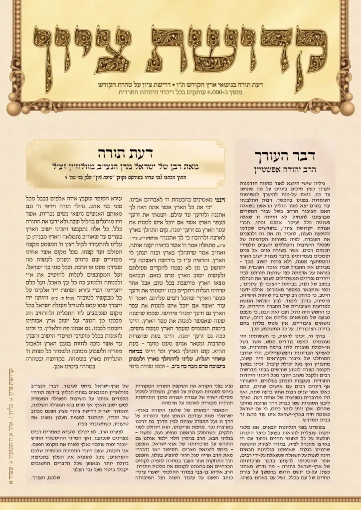 גיליון שישי היוצא לאור מהווה הזדמנות לערוך כעין סיכום ביניים על מה שהושג עד כה, וזאת על-מנת להיערך למשימות העומדות בפנינו בהמשך. רבות התלבטנו עוד בטרם יצא לאור הגליון הראשון בשאלה האם הציבור הרחב בשל עבור המסרים שברצוננו להנחיל. לא הייתה זו שאלה פשוטה כלל ועיקר. אמנם זכינו, חברי אגודת "קדושת ציון", בחודשים שקדמו להופעת […]